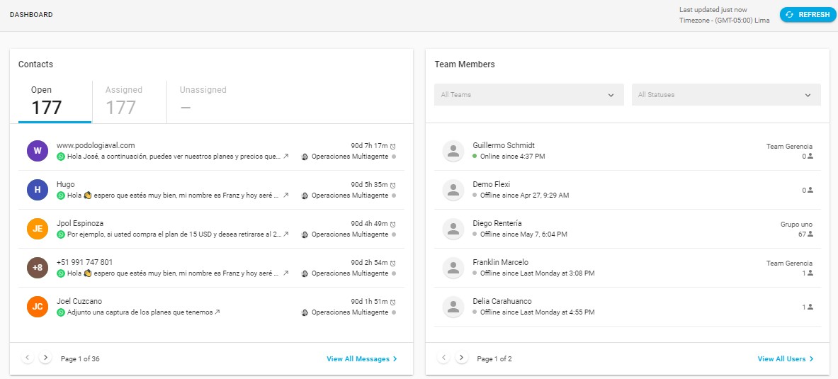 WhatsApp Business Multiagente de FlexiNumber ofrece un dashboard con métricas de atención por WhatsApp y muestra las conversaciones con los clientes para mejorar las ventas. También contiene funcionalidades como mensajes automáticos, gestión de contactos, mensajes internos y encuestas.